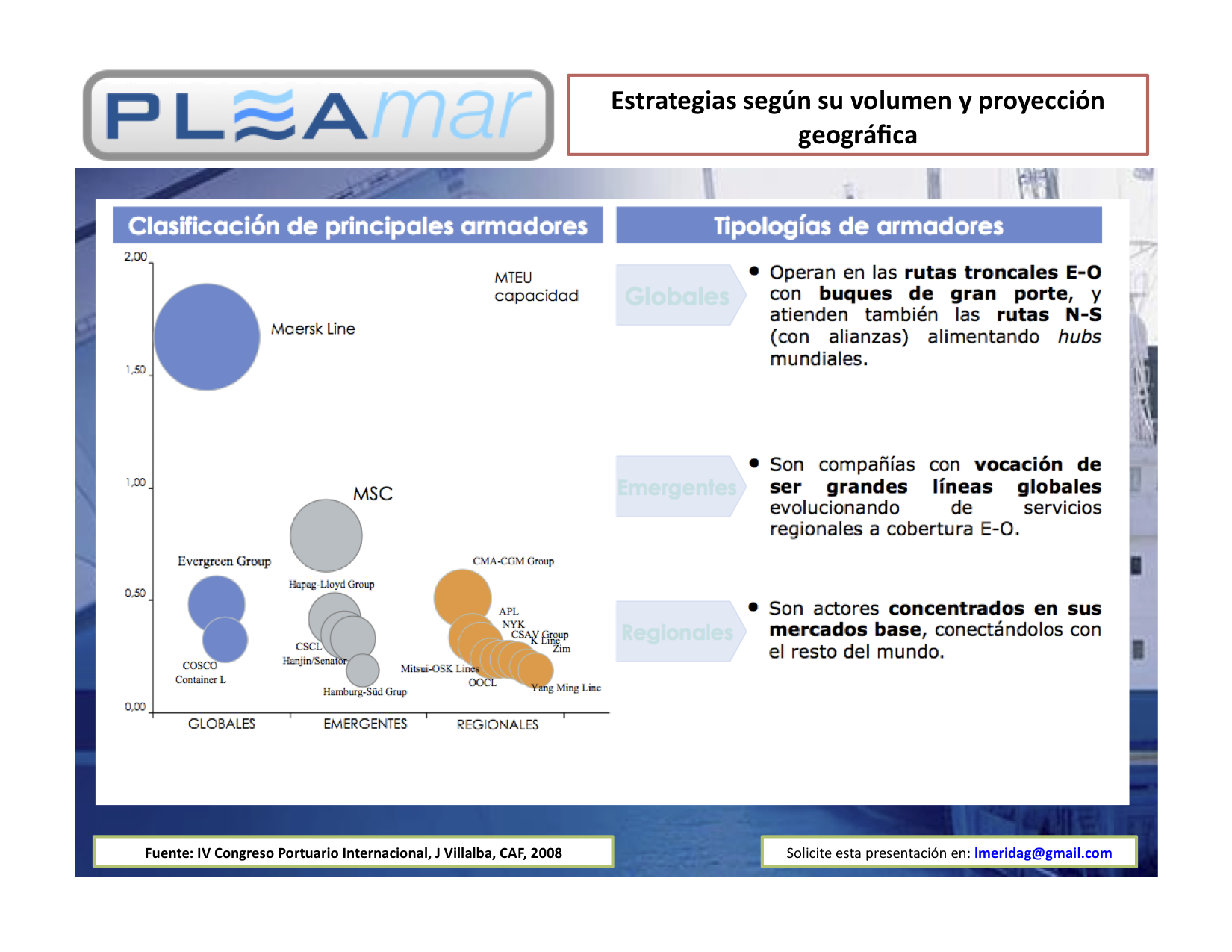 Las principales empresas navieras no sólo están aumentando su tamaño y capacidad de participación en el mercado mediante la introducción de buques más grandes, que les permiten mover mayor volumen de carga a menor costo, sino que también lo hacen mediante la formación de alianzas estratégicas o mediante la adquisición o fusión de las empresas competidoras.