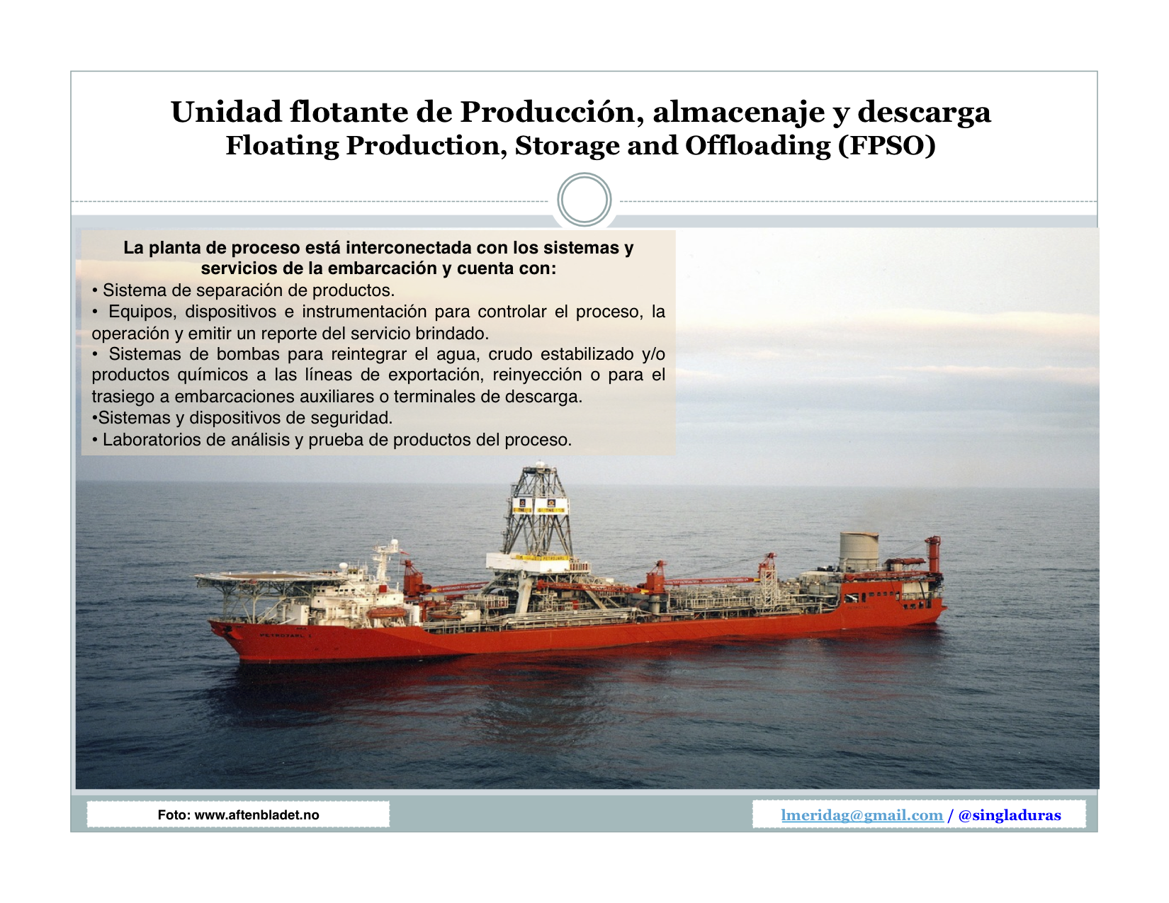 Es un tema interesante que genera muchas interrogantes además de las ya comentadas anteriormente. Para tratar de aclarar esas dudas, valdría la pena comenzar revisando el contenido del curso FPSO training course organizado por IBC Energy mientras esperamos recibir sus comentarios relativos a las inquietudes planteadas.