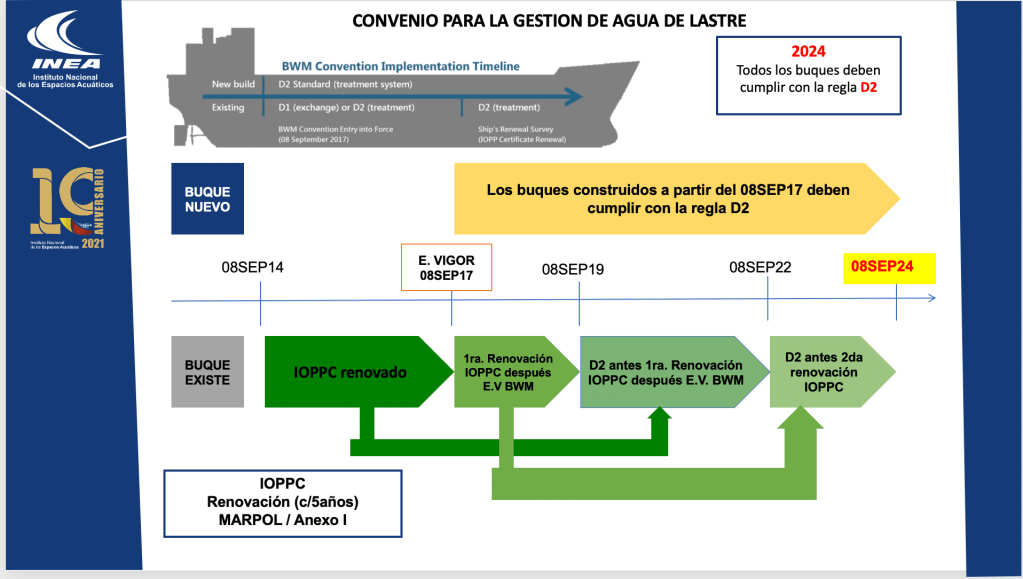 Para la mayoría de los buques, esto significa instalar equipos especiales para tratar el agua de lastre. El Comité de protección del medio marino (MEPC), acordó un calendario de implantación para los buques existentes, relacionado con el Certificado internacional de prevención de la contaminación por hidrocarburos (Certificado IOPP) que se otorga en el reconocimiento de renovación.