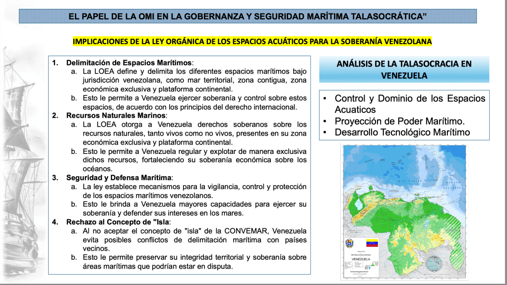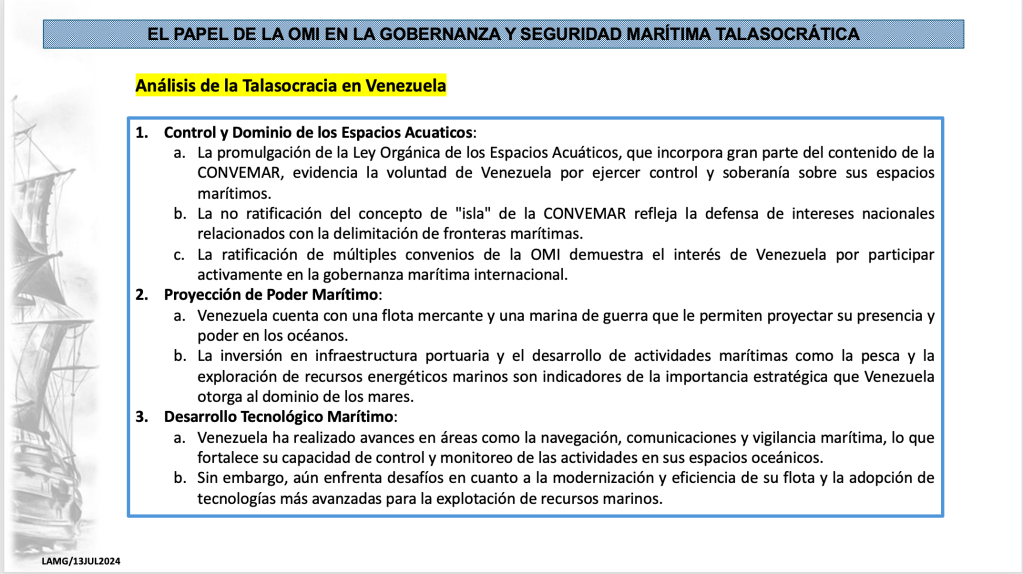 En este sentido, la participación activa de Venezuela en la OMI puede ser vista como una herramienta para ejercer su Talasocracia, es decir, para fortalecer su influencia y liderazgo en el ámbito marítimo regional e internacional. A través de la OMI, Venezuela puede promover sus intereses, defender sus derechos y contribuir a la construcción de un orden marítimo más justo y equitativo.