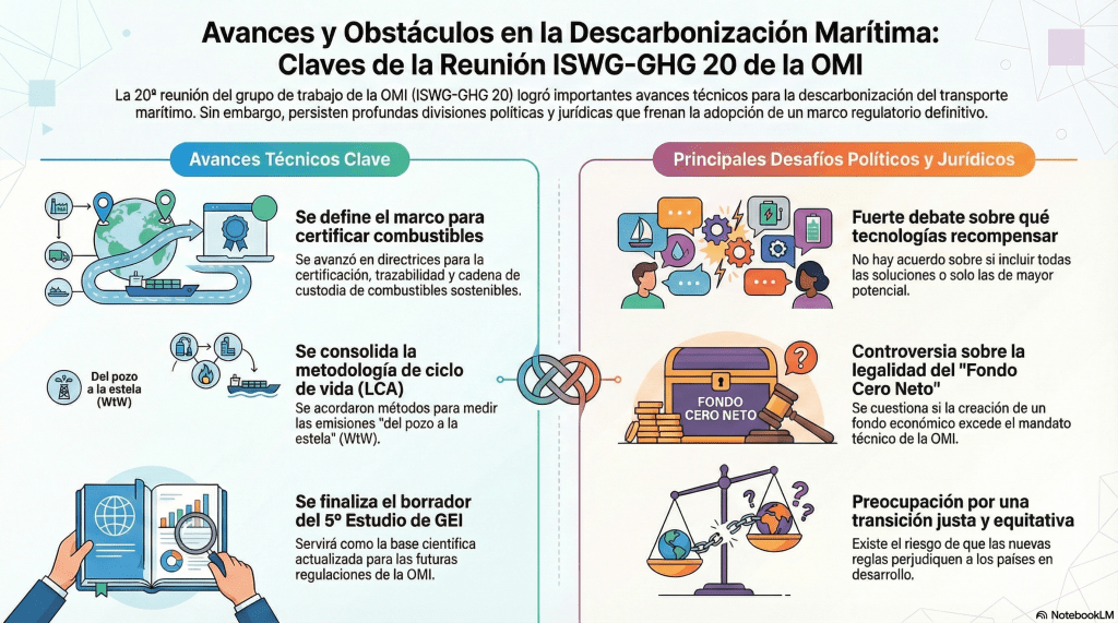 La vigésima reunión del Grupo de Trabajo Intersesional sobre la Reducción de las Emisiones de GEI de los Buques (ISWG-GHG 20), celebrada del 20 al 24 de octubre de 2025, marcó un avance técnico significativo en la preparación del Marco Cero Neto de la OMI (IMO Net-Zero Framework), a pesar de la incertidumbre regulatoria generada por el aplazamiento de su adopción formal por el MEPC/ES.2.