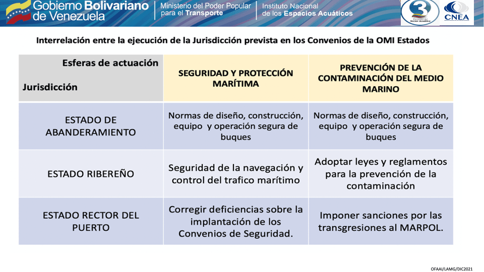 La CONVEMAR define la jurisdicción del Estado de abanderamiento, del Estado ribereño y del Estado rector del puerto y los instrumentos de la OMI especifican cómo debería ejercerse dicha jurisdicción para garantizar el cumplimiento de las reglas sobre seguridad y prevención de la contaminación en el sector marítimo.